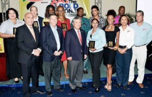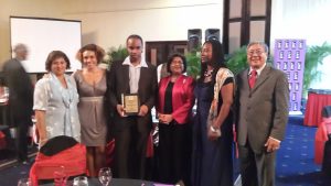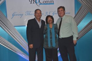 Jean Lowrie-Chin, PROComm's Founder and Executive Chairman (left) shares in a photo moment with Justin Morin, Digicel Jamaica's CEO (centre) and Hubert Chin, PROComm's Administrative Director at PROComm's 40th Anniversary party on Thursday, November 29 at The Jamaica Pegasus Hotel.