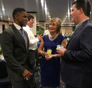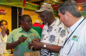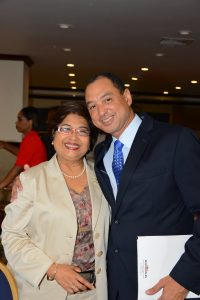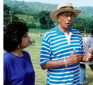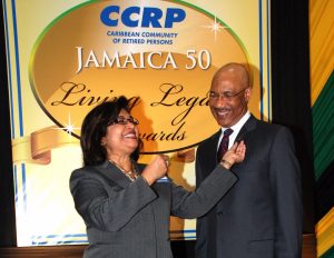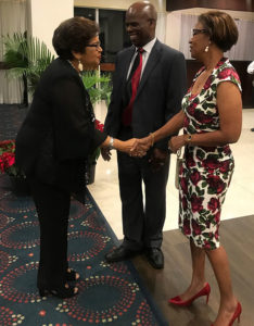 Jean Lowrie-Chin, PROComm's Founder and Executive Chairman (left) cheerfully greets The Honourable Steadman Fuller and Mrs. Fuller on their arrival at PROComm's 40th Anniversary party on Thursday, November 29 at The Jamaica Pegasus Hotel.