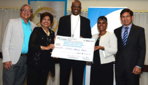 Principals of PROComm Ltd, Hubert Chin and Jean Lowrie-Chin mark their company's 40th Anniversary by presenting funds totalling $400,000 to Most Rev. Archbishop Kenneth Richards (centre) for The Archbishop's Development Fund, Kali McMorris, Principal of Convent of Mercy 'Alpha' Academy and Christopher Cargill of Stella Maris Church Council for the Church's Ministries. The presentation took place recently at the Jamaica Pegasus Hotel, the first location of PROComm's operations.