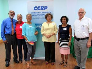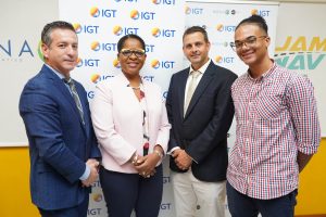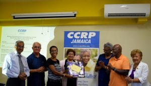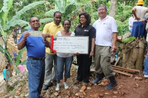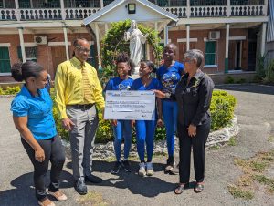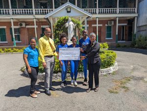 Principals of PROComm Ltd, Hubert Chin and Jean Lowrie-Chin mark their company’s 40th Anniversary by presenting funds totalling $400,000 to Most Rev. Archbishop Kenneth Richards (centre) for The Archbishop’s Development Fund, Kali McMorris, Principal of Convent of Mercy ‘Alpha’ Academy and Christopher Cargill of Stella Maris Church Council for the Church’s Ministries. The presentation took place recently at the Jamaica Pegasus Hotel, the first location of PROComm’s operations.